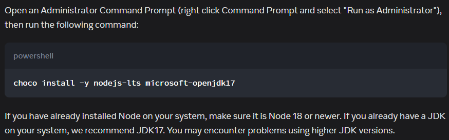 그러다가 다시 chocoratey로 돌아온 결정적 이유는 앞에서 말한것 처럼 많은 페이지에서 chocoratey 기준으로 개발환경을 설명한것이기 때문인데, 예를들면 react native 개발환경은 다음처럼 설명되어 있다.